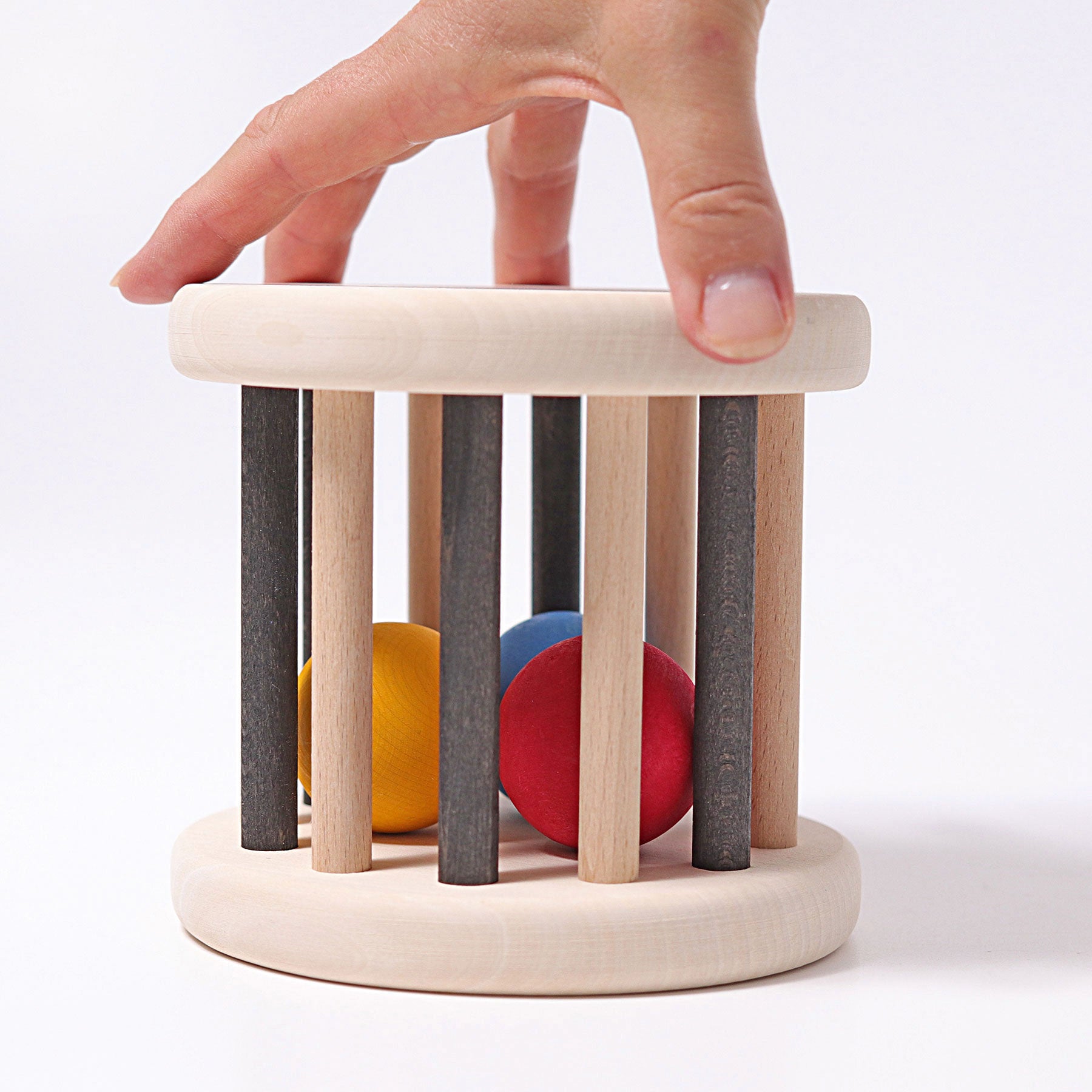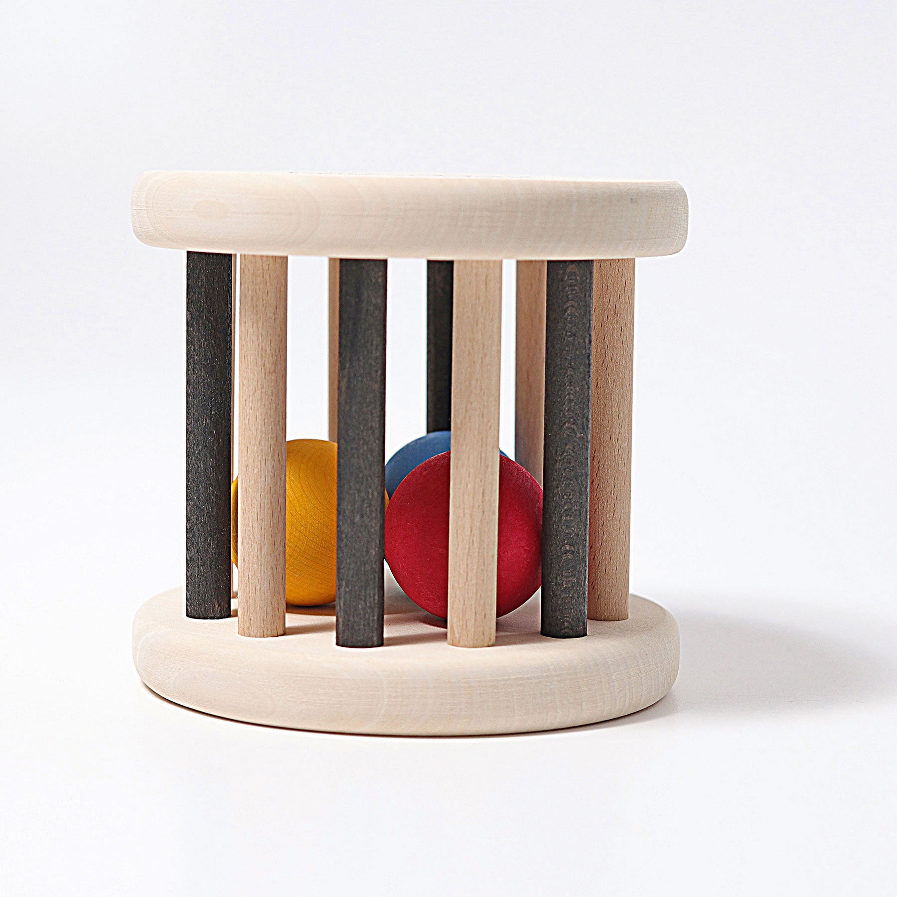 This colourful wheel inspires children to crawl and walk after it: 3 wooden balls inside makes a rattling sound. Our monochrome toys are designed with maximum reduction in both form and colour. And the high contrast in colour as well as textured surfaces of the monochrome series of toys help to develop individual needs. Children with visual handicaps will be motivated to discover the world around them by discerning a more visible world. This multisensory toy with high contrast colouring and motion driven sound will aid in development and stimulation of particular senses. Rolling wheel with wooden beads.